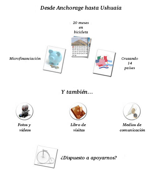 ÚLTIMAS NOTICIAS:. Bienvenidos a la versión en español de nuestra web. Gloria ha realizado todas las traducciones para nosotros. Nos gustaría darle las gracias sinceramente por todo el trabajo que ha hecho. Las "últimas noticias" las encontrarán principalmente en las versiones en francés y en inglés de nuestra web. ¡No duden en echarles un vistazo! En ésta, la versión en español, también podrán encontrar mucha información acerca de nuestra aventura en bicicleta y nuestro trabajo sobre las microfinanzas. |